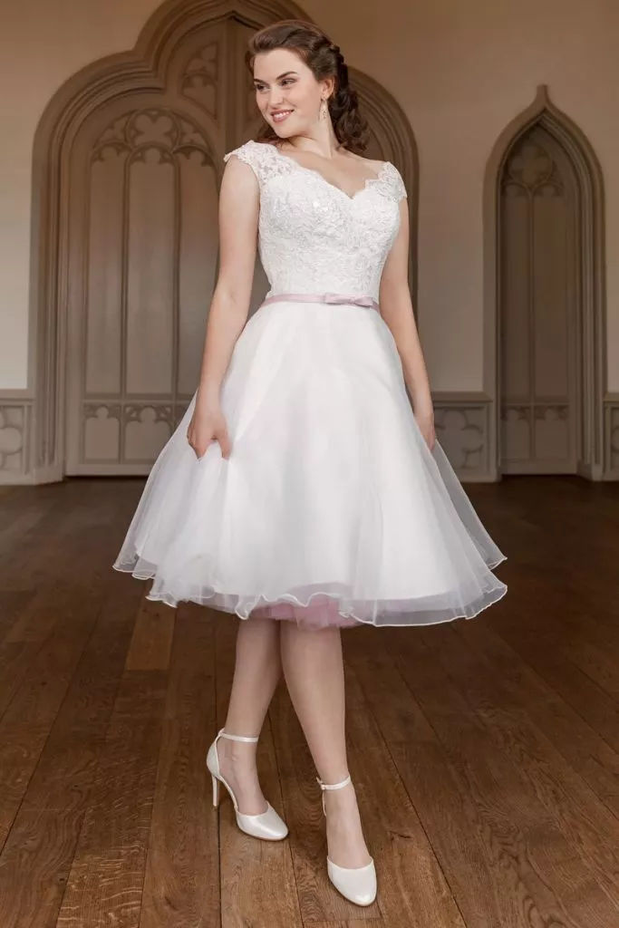 Deze trouwjurk is een speelse knipoog naar vintage charme en moderne elegantie. Met haar korte rok van luchtige tule en lijfje van romantisch kant straalt ze pure vreugde uit. Het subtiele roze lint accentueert de taille op lieflijke wijze. Een unieke keuze binnen speelse bruidsjurken – perfect voor een bruiloft vol dans, plezier en een ontspannen sfeer.