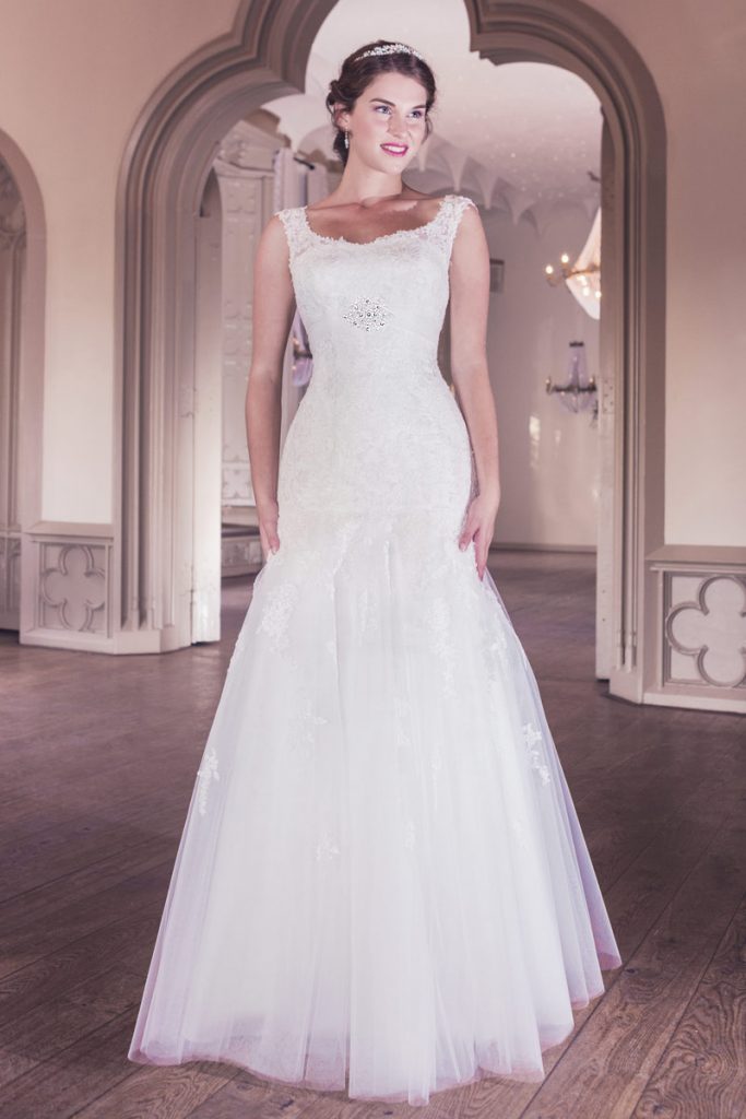 Emma straalt klassieke charme uit met haar verfijnde kanten lijfje en brede schouderbandjes. In het midden schittert een sierlijk ornament dat het silhouet elegant accentueert. De rok valt soepel in een lichte A-lijn van zachte tule, wat zorgt voor een luchtige, vloeiende beweging bij elke stap. Een tijdloze keuze met een romantisch hart.