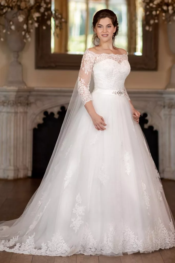 Deze bruidsjurk, genaamd Jasmine, ademt klassieke romantiek met een luxueuze flair. De fijne kanten mouwen en boothalslijn zorgen voor een gracieuze uitstraling, typerend voor elegante bruidsjurken met een tijdloos karakter. Het glinsterende ceintuur legt een subtiel accent op de taille. De volle tule rok vloeit elegant naar beneden en eindigt in een prachtige sleep met verfijnde kanten afwerking. Perfect voor een betoverende bruiloft waar tijdloze charme centraal staat.