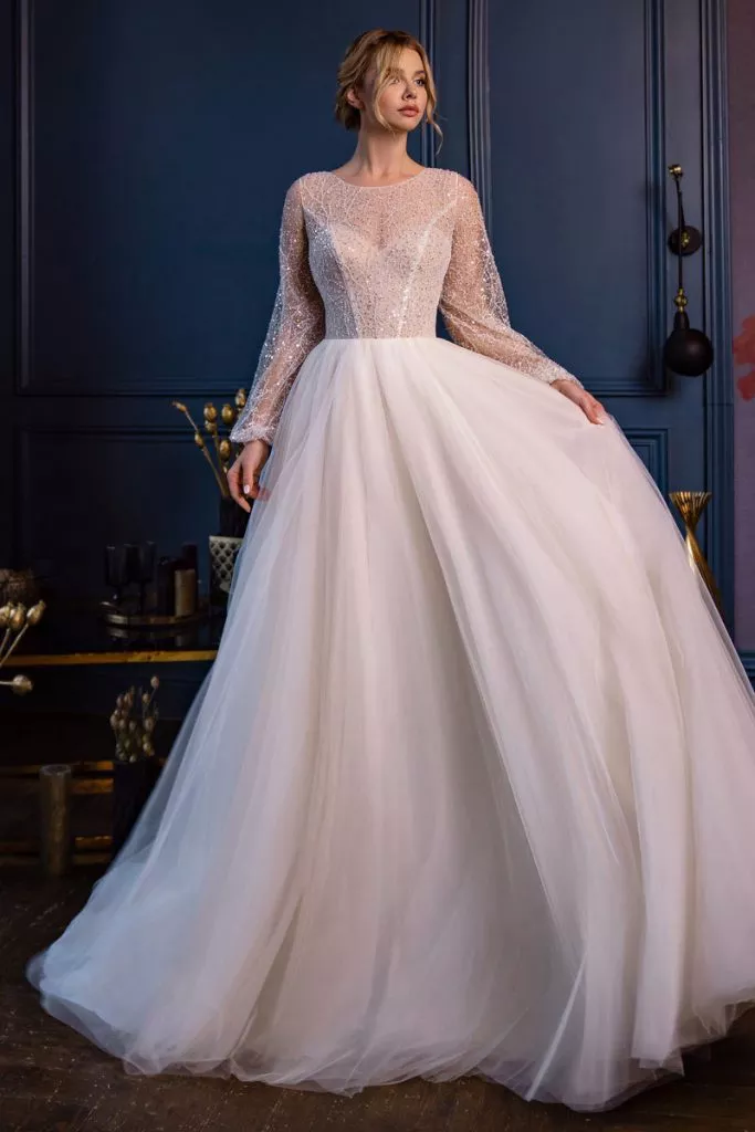De trouwjurk Sandrina is een dromerige keuze voor een romantische bruiloft. De sprankelende lijfje met subtiele glittertjes vangt het licht op een betoverende manier, terwijl de lange transparante mouwen voor een elegante touch zorgen. De rok van zachte tule valt vloeiend naar beneden en creëert een sprookjesachtige uitstraling. Deze bruidsjurk is ideaal voor bruiden die willen stralen met stijl en verfijnde charme.