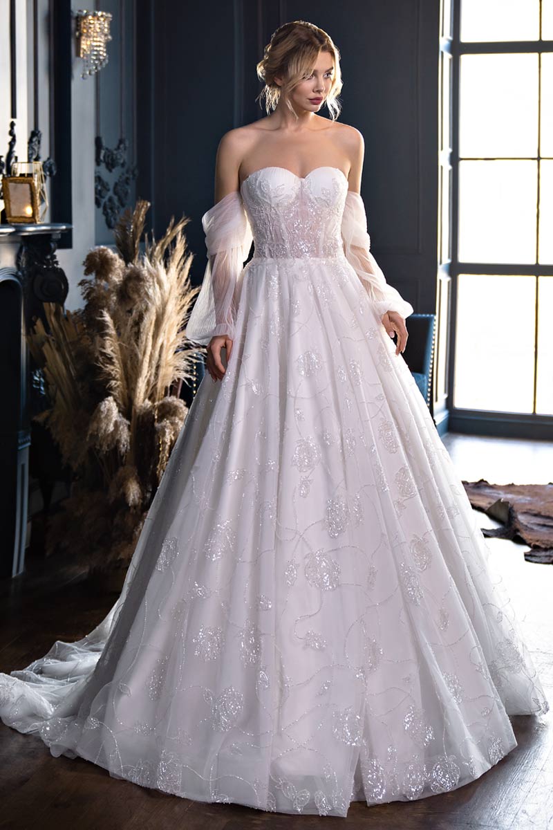 Trouwjurk Renee is een stralende verschijning, ontworpen voor de bruid die van glans en zachtheid houdt. Te midden van elegante trouwjurken schittert ze met glinsterende tule, versierd met een verfijnd patroon van bloemenborduursels, wat een subtiel sprankelend effect geeft bij elke beweging. De geplooide afhangende mouwen zorgen voor een luchtig, romantisch accent, terwijl het korsetlijfje met hartvormige lijn het geheel een zachte, vrouwelijke uitstraling verleent. Perfect voor een betoverende bruiloft vol licht en elegantie.