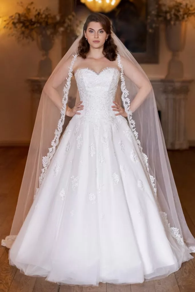 Trouwjurk Scarlet straalt tijdloze elegantie uit met een klassiek silhouet en een romantisch hartvormig lijfje. De subtiele kantenapplicaties zorgen voor verfijning en diepte, terwijl de lange sluier met kanten rand een koninklijke touch toevoegt. Deze bruidsjurk is perfect voor een grootse bruiloft met een vleugje traditie en een overvloed aan stijl. Scarlet is voor de bruid die wil stralen met gratie en allure.