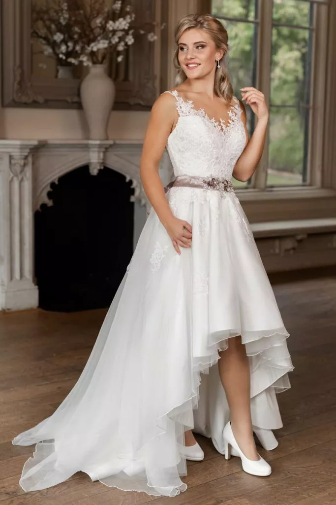 Trouwjurk Summer is een speelse en elegante bruidsjurk met een moderne twist. De asymmetrische zoom laat de benen subtiel zien aan de voorkant, terwijl de langere achterkant voor een dramatisch effect zorgt. Het kanten lijfje met bloemenapplicaties en de satijnen ceintuur met rozenaccent benadrukken het vrouwelijke silhouet. Ideaal voor een bruid die charme, comfort en een tikkeltje eigenzinnigheid wil combineren op haar bruiloft.